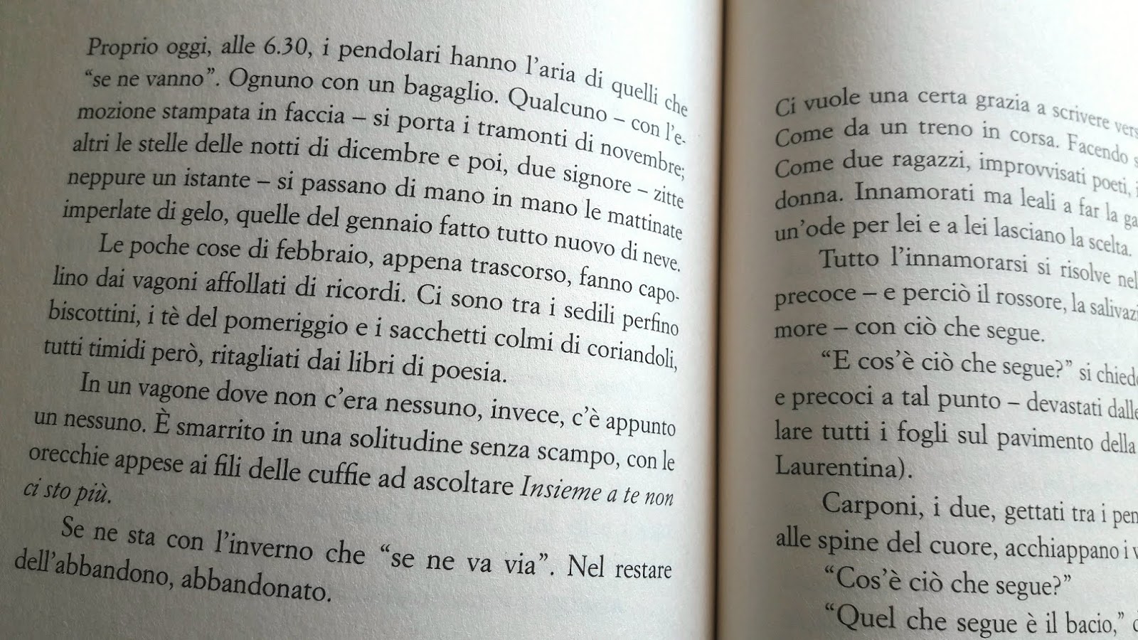 Dans un wagon où il n'y avait personne, il y a justement une personne. Il est perdu dans une solitude sans échappatoire, avec les oreilles suspendues aux fils des écouteurs qui diffusent Insieme a te non ci sto più [Je ne suis plus avec toi].